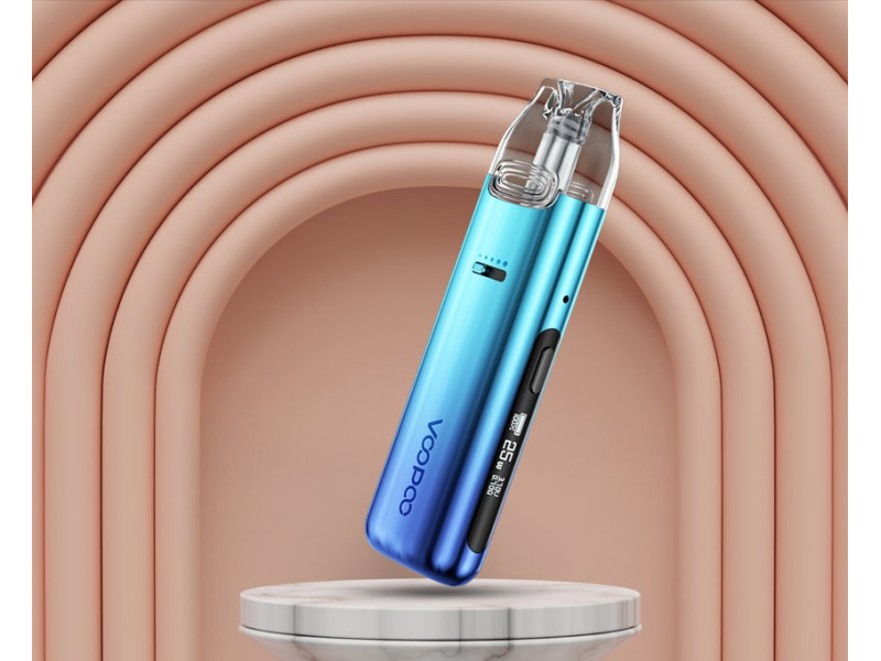 Внешне данный девайс выглядит привычно как для аналогичных устройств начального уровня, так и для продукции от VOOPOO. Это длинный и скругленный по бокам прибор, с тонкой темной гранью, за которой расположен маленький экран. Сверху находится картридж, а внутри — аккумулятор и плата с датчиком шума, который активирует устройство при затяжке.